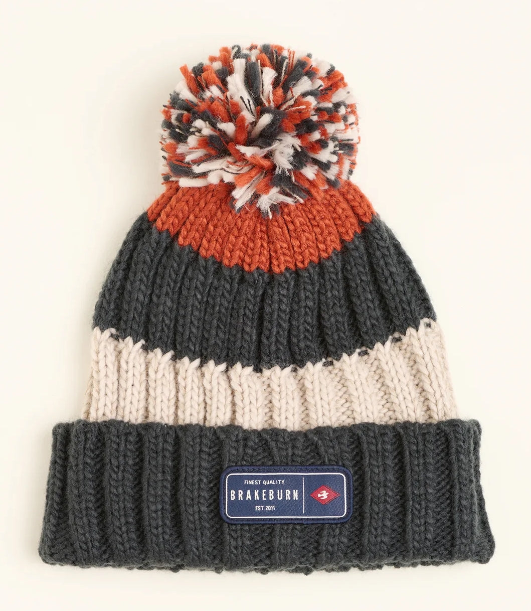 Introducing the Brakeburn Stripe Beanie, made with 100% Acrylic yarn, with a ribbed knit, block stripe pattern, multicoloured pom pom and turned back hem for extra warmth around the ears.