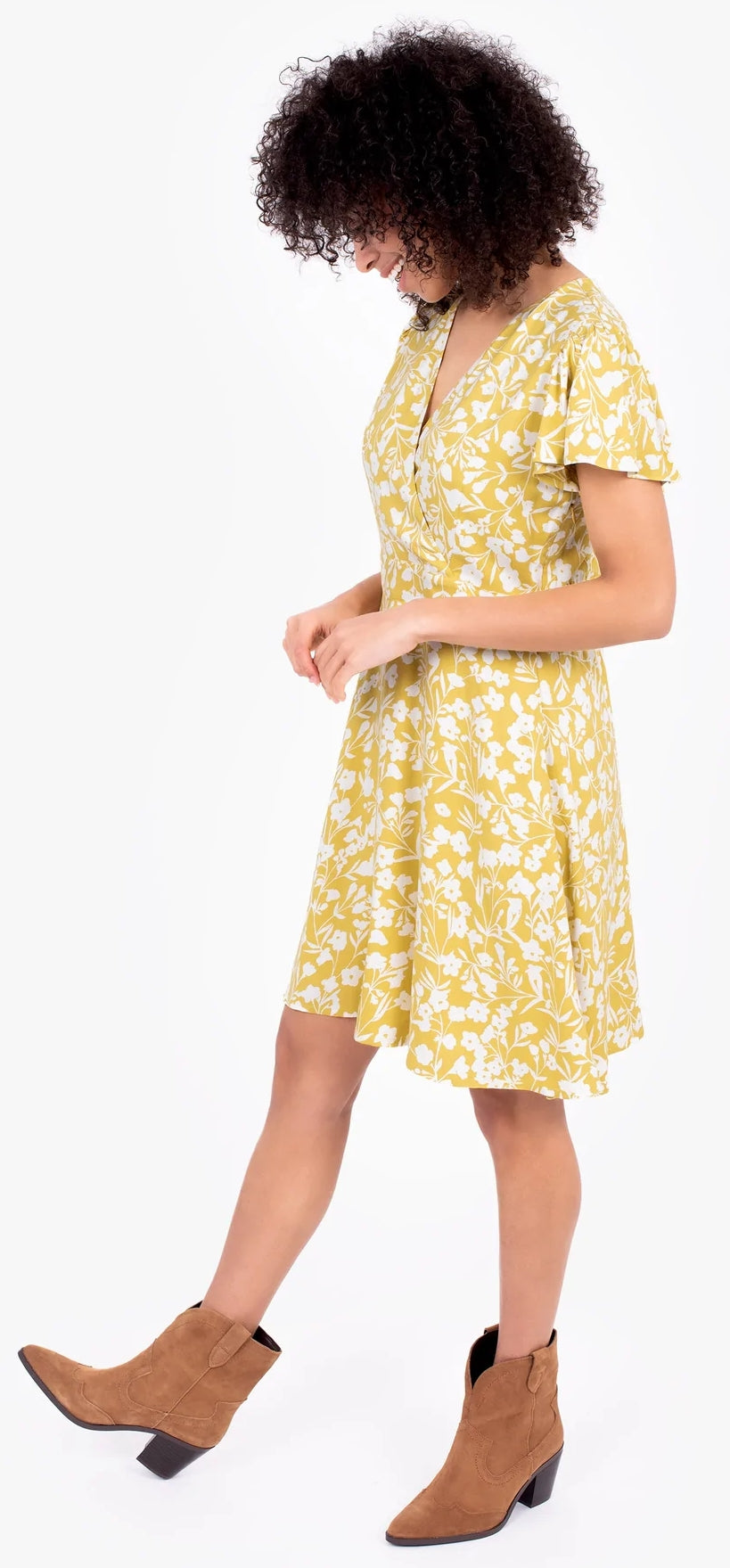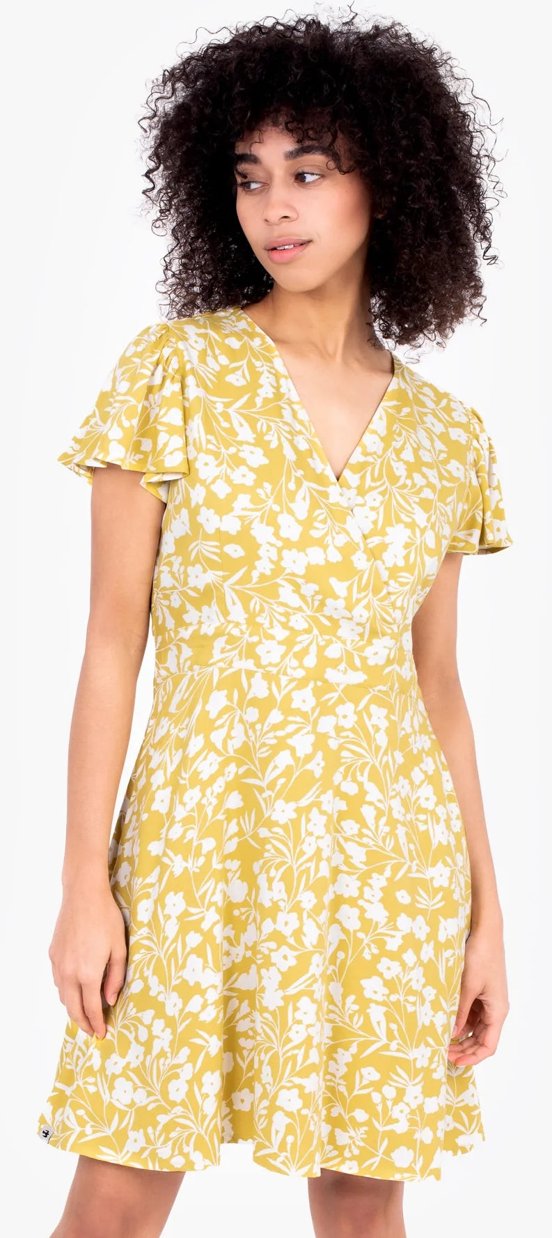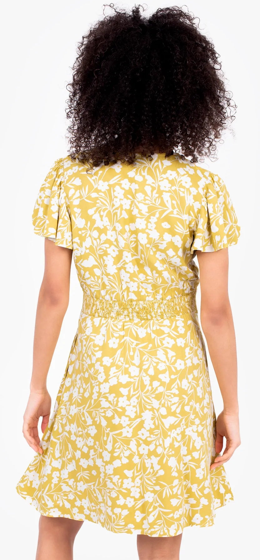 The Brakeburn Ayla wrap made from a soft and silky 100% Viscose outer fabric, with a comfortable 100% Cotton lining. The yellow fabric features a delicate white floral pattern, perfectly complemented by the wrap neckline and loose-fitting short sleeves. A concealed side zip and elasticated back complete this must-have dress.