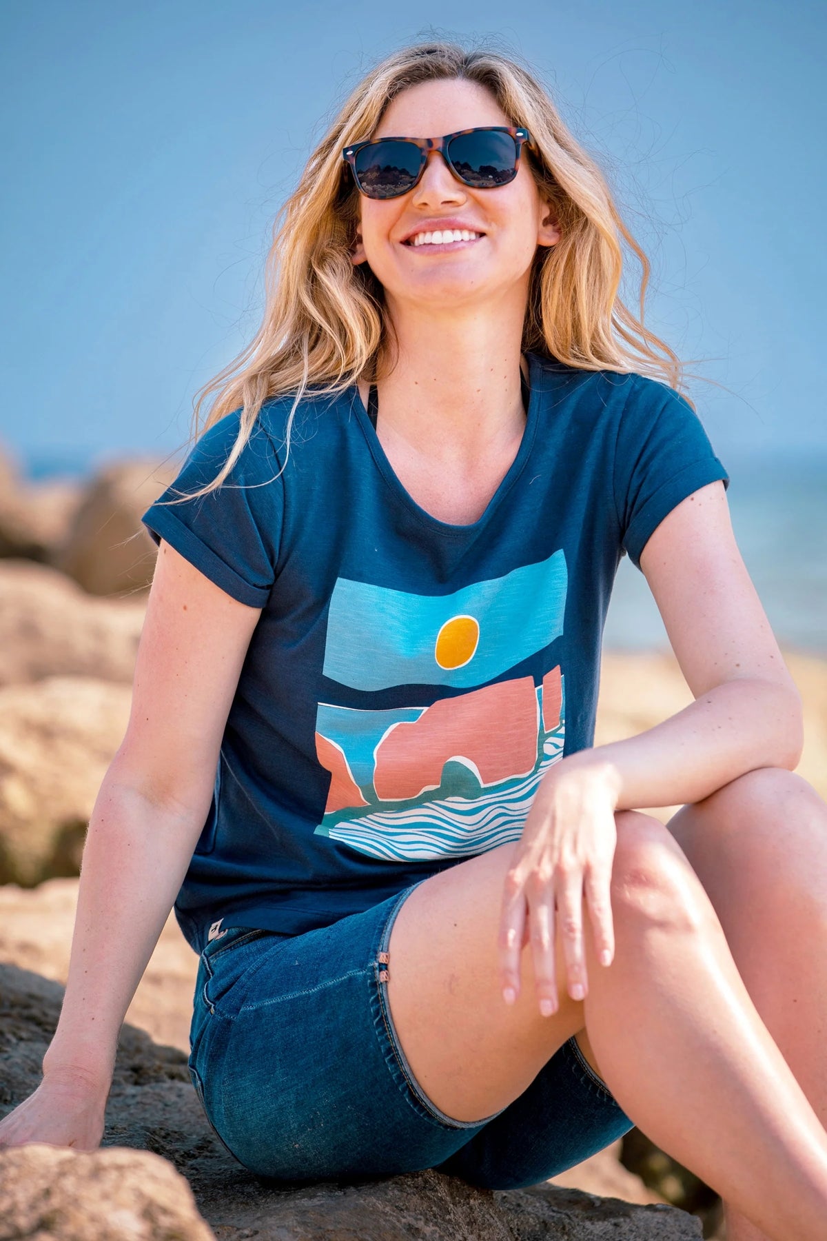 This Brakeburn women's Landscape t-shirt in Navy is made from 100% cotton slub fabric, featuring a coastal landscape print on the front, round neckline, short sleeves, and curved bottom hem with small logo label for a touch of subtle branding to this casual, everyday tee.
