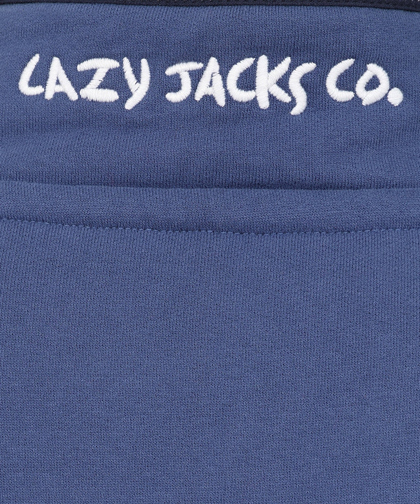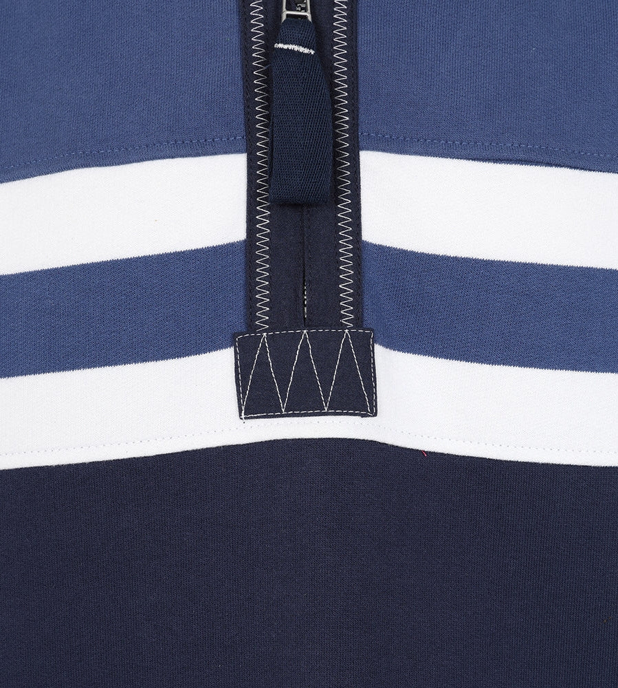 The Lazy Jacks men's LJ51 zip neck stripe sweatshirt in Denim Blue, made from a 100% cotton fabric with brushed back inner, this sweatshirt features a 1/4 zip neckline, block stripe pattern, soft touch elasticated cuffs, side slits and a slight droptail at the back. With logo embroidered on the back of the collar, and small logo labels on the sleeve and bottom hem.