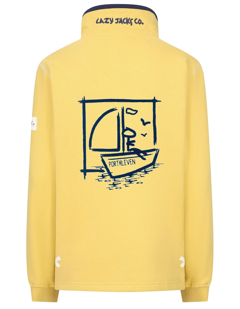 The Lazy Jacks women's LJ3 Porthleven print sweatshirt, made with 100% brushed back cotton, this pullover features a 1/4 zip neckline, side slits, elasticated cuffs, and a boat print with Porthleven place name on the back. Complete with a logo patch on the left sleeve, bottom hem and embroidery on the back collar.