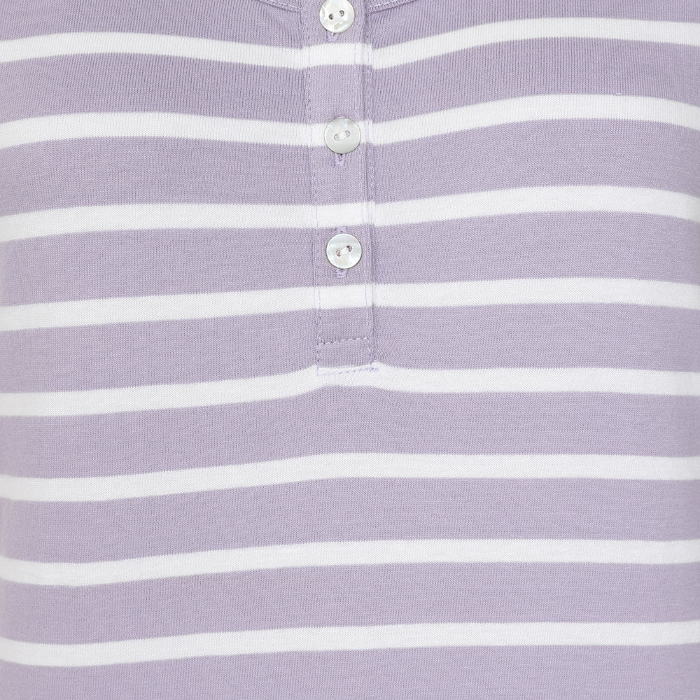 The Lazy Jacks LJ110 vest is crafted from 100% cotton, featuring a classic lilac and white stripe design. It has three functional buttons at the neckline for customizable comfort and a small logo label discreetly sewn on the bottom hem. This vest offers a flattering fit and reliable quality for everyday wear.