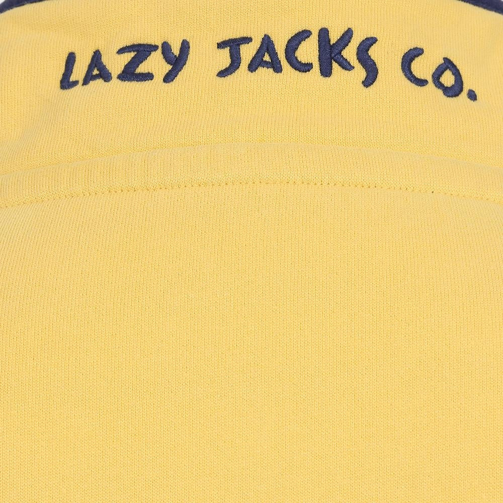 This Lazy Jacks women's LJ3 Zip neck sweatshirt in Lemon Yellow is both stylish and comfortable. Made with 100% cotton, it features a 1/4 zip neckline and elasticated cuffs for added flexibility. The logo patch on the left sleeve and embroidery on the back of the collar add a touch of unique branding.