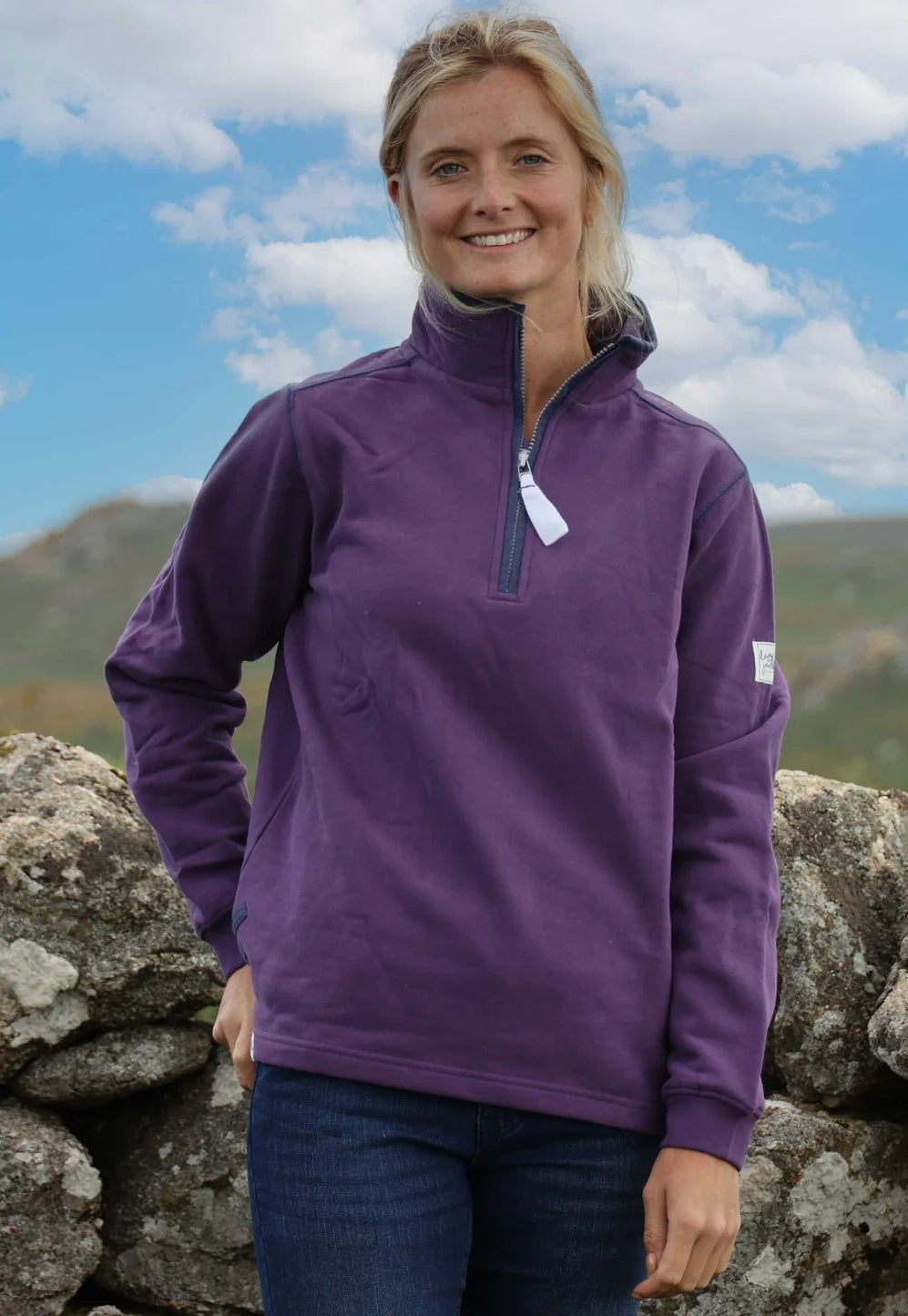 The Lazy Jacks women's LJ3 zip neck sweatshirt in Loganberry, made from 100% cotton, this pullover features a 1/4 zip neckline, elasticated cuffs, and a logo patch on the left sleeve and back of the collar.