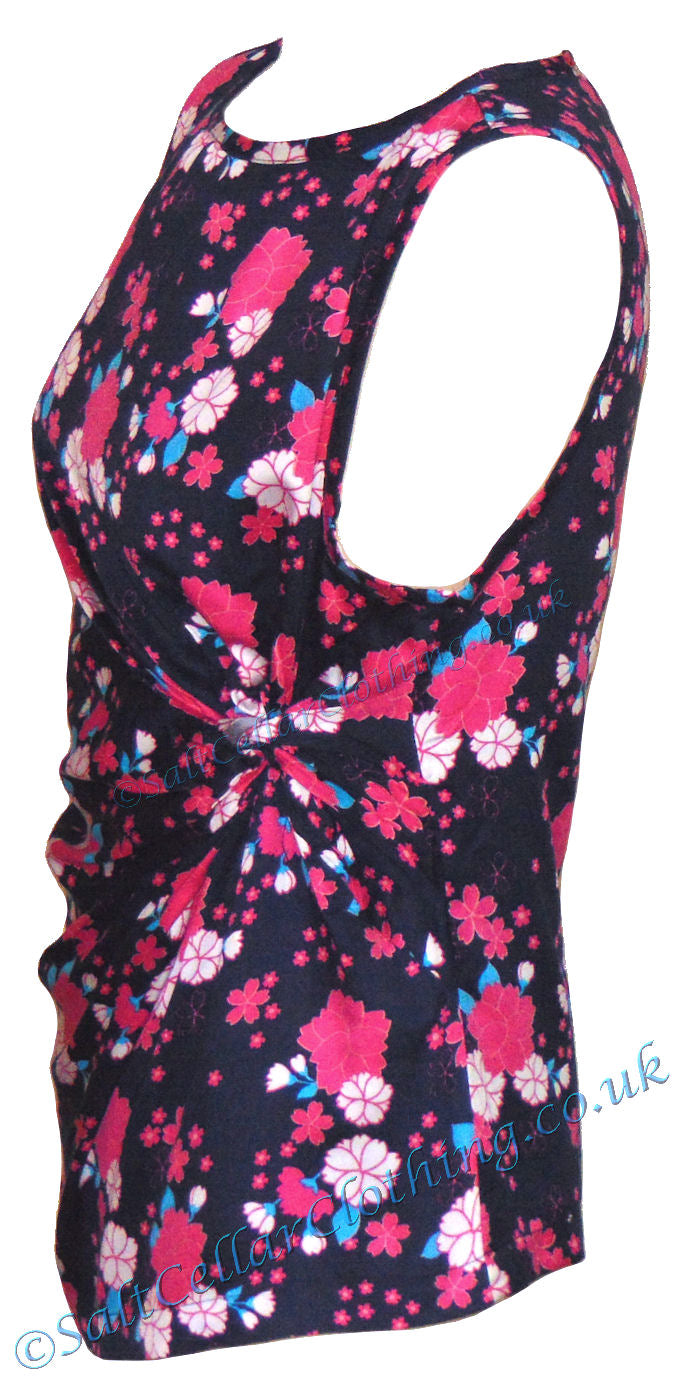 The Mudd & Water women's Akemi top in Floral Print Navy offers a smooth and silky feel with its 100% Tencel outer fabric and 100% organic cotton lining. Its concealed zip back and top hook make it easy to wear, while the side twisted knot style adds a touch of elegance. The curved bottom hem completes the look. Machine washable for convenience.