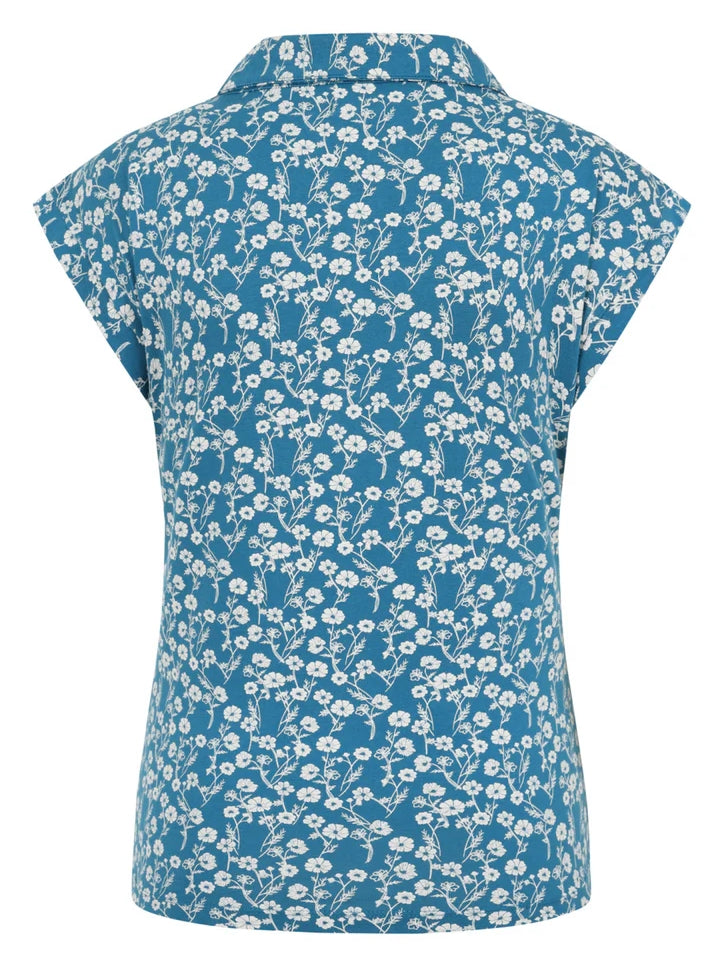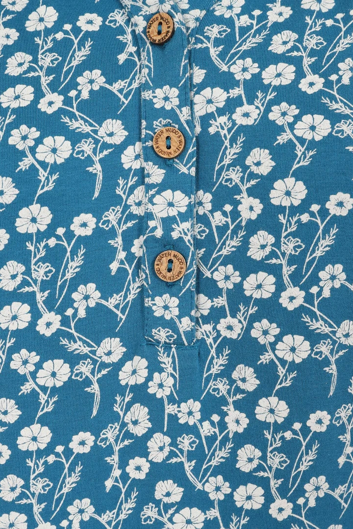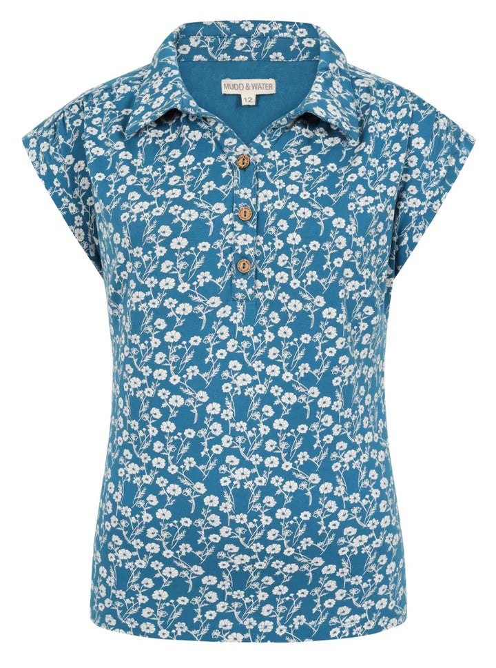 Introducing the Mudd & Water women's Alice Top, featuring a soft and stretchy blend of 95% organic cotton and 5% elastane. With cap sleeves, a collared neckline, and coconut buttons, this teal blue top is elevated by a white floral Meadow pattern.