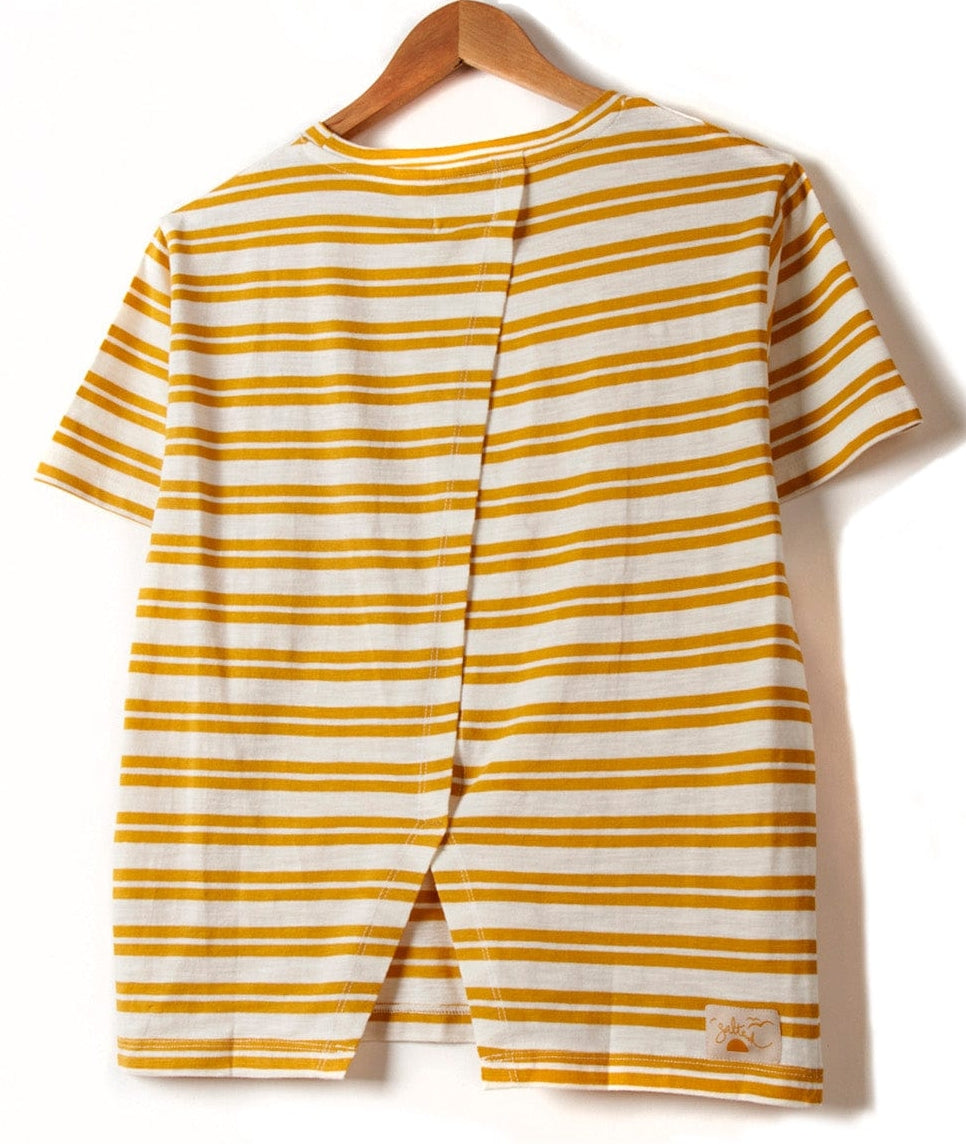 The Saltrock women's Camilla stripe t-shirt in Yellow, made from 100% cotton, this t-shirt features a stylish yellow stripe pattern, short sleeves, and a round neckline. The split back seam design adds a unique touch, while the embroidered palm tree on the chest and logo label on the back offer a touch of beachy flair.