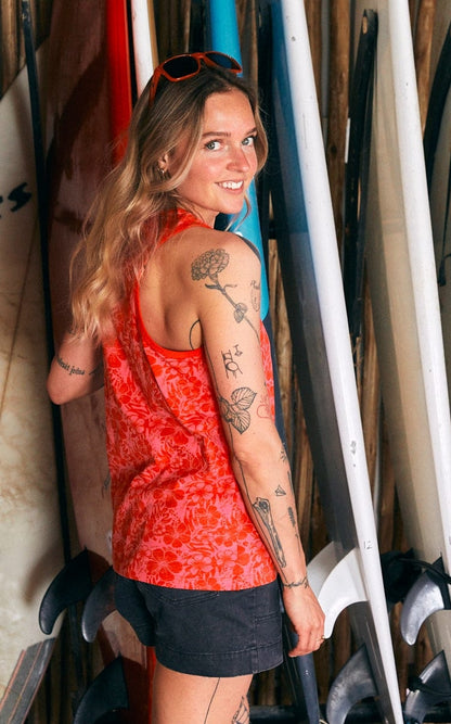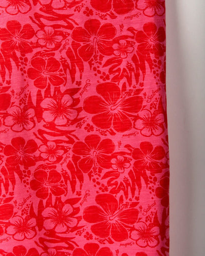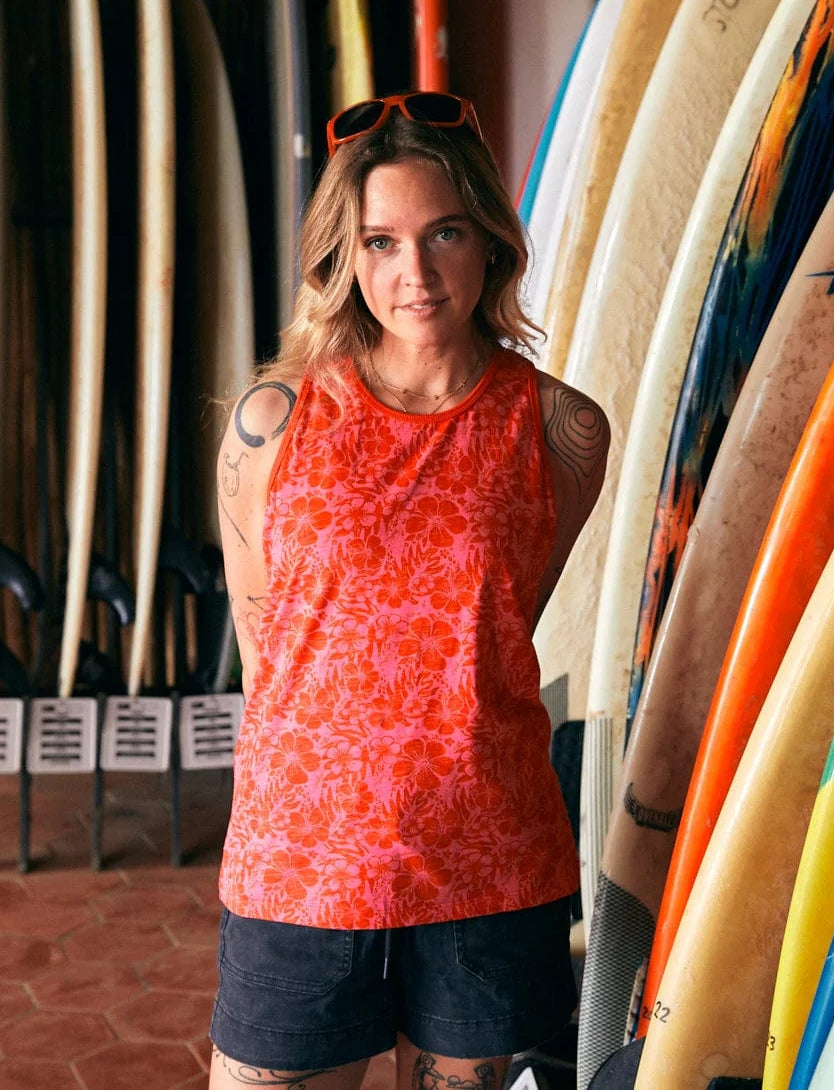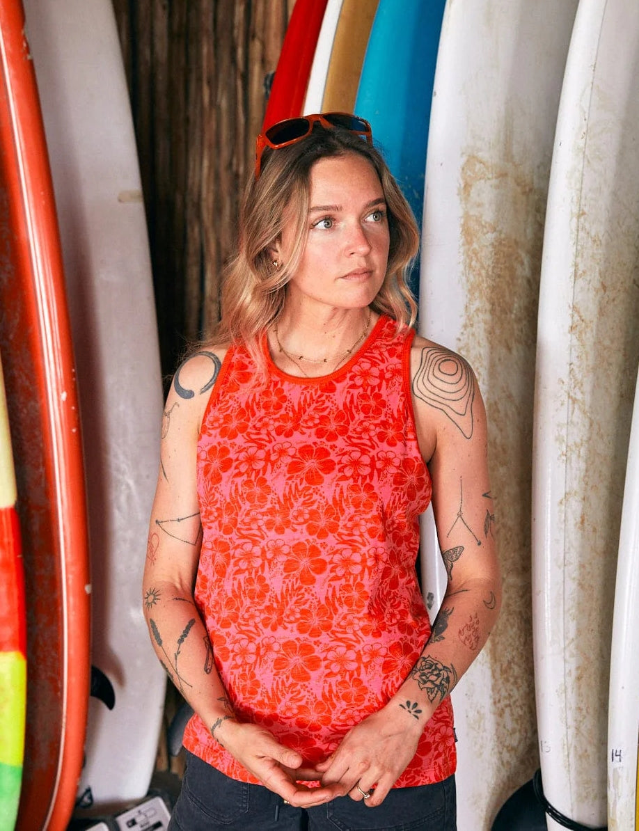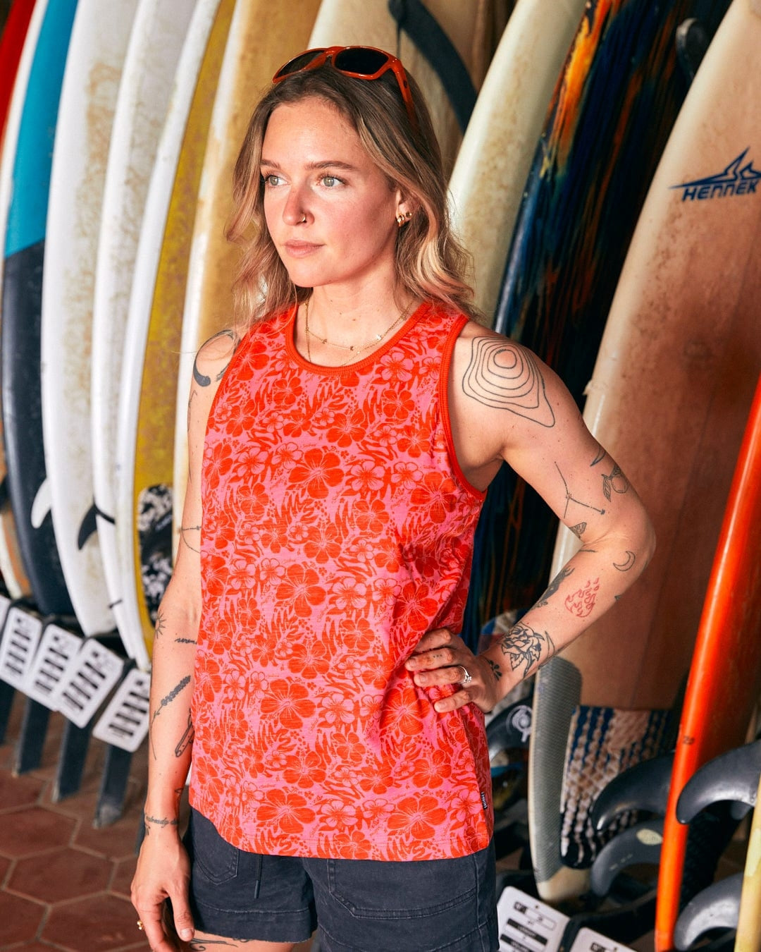 The Saltrock women's Hibiscus vest in red, made from 100% cotton slub fabric, featuring a pink base with a beautiful red tropical Hibiscus floral pattern. With a round neckline and ribbed trim.