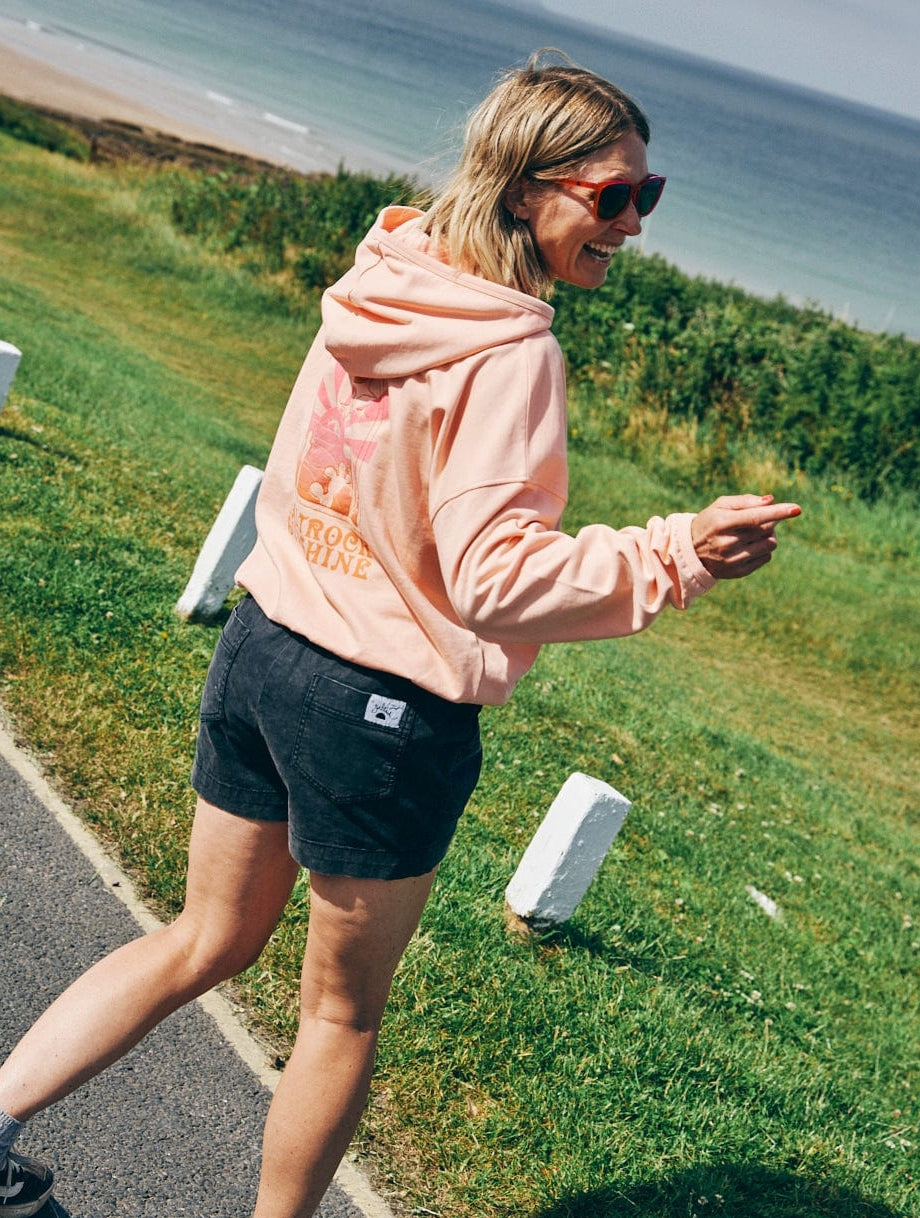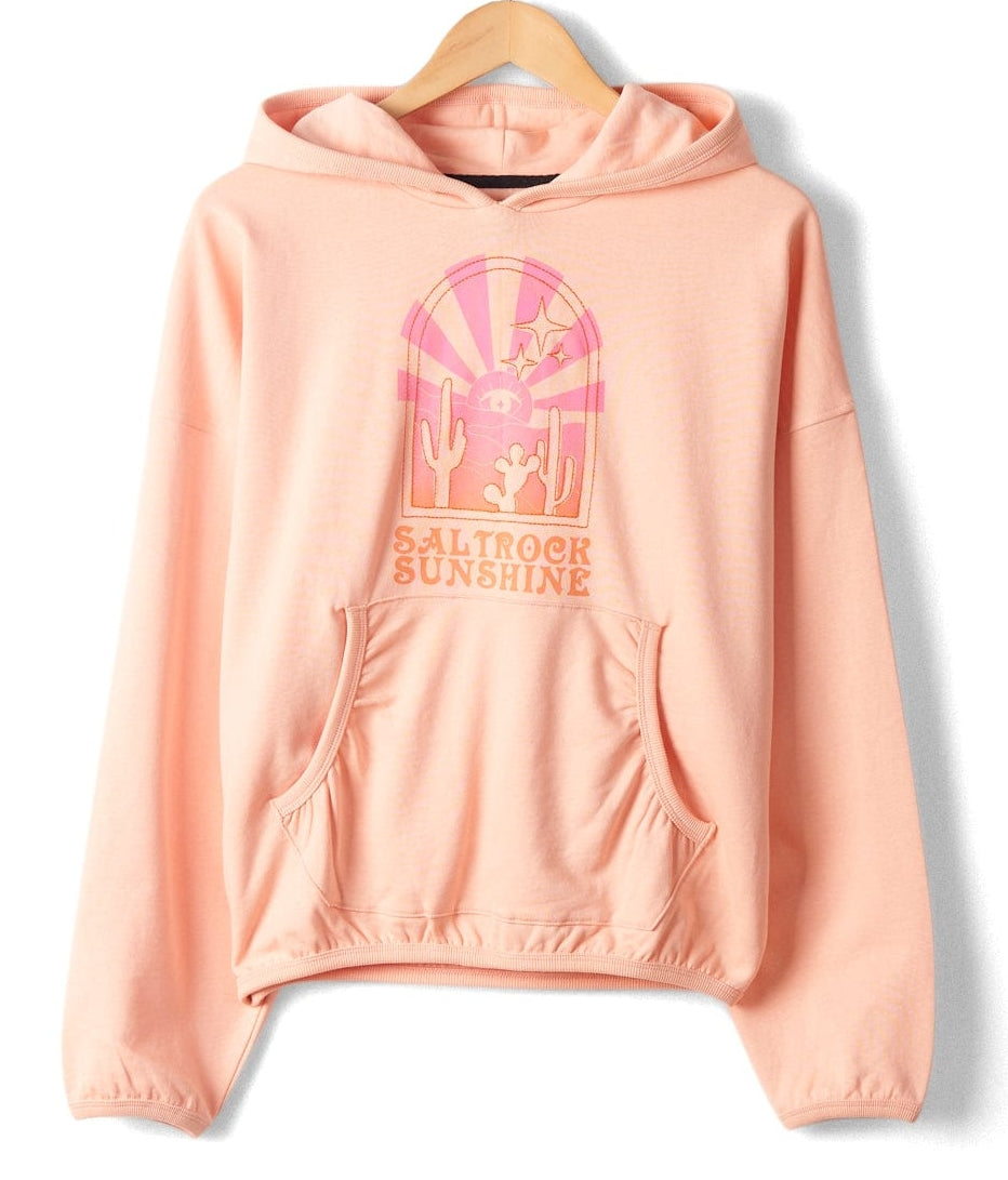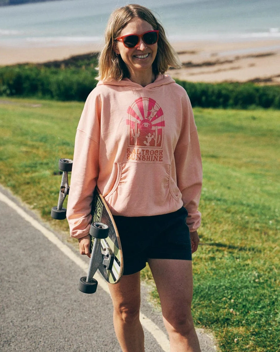 The Saltrock women's Sunshine Pop Hoodie in peach, made from 100% cotton brushed back sweatshirt fabric, this loose-fitting hoody features a charming sunshine and cactus design on the front and back. With elasticated cuffs and a tummy pocket, this hoody offers both comfort and convenience while the gathered fabric detail adds a unique touch.