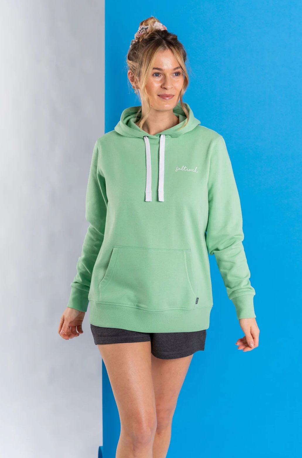 The Saltrock Velator pop hoodie in Light Green, made with a comfortable blend of 60% cotton and 40% recycled polyester. The pop over style and elasticated cuffs and hem provide a flattering casual fit, with a drawstring hood, tummy pockets and a small printed logo on the front.