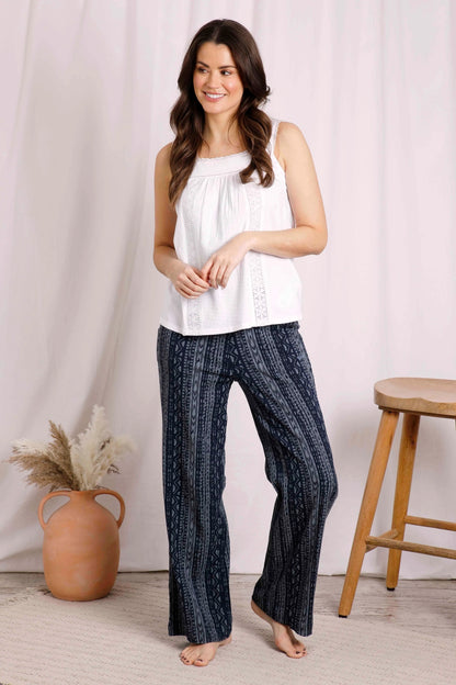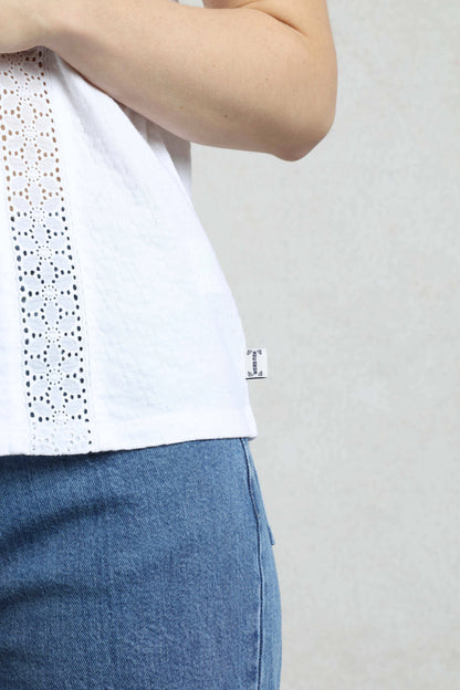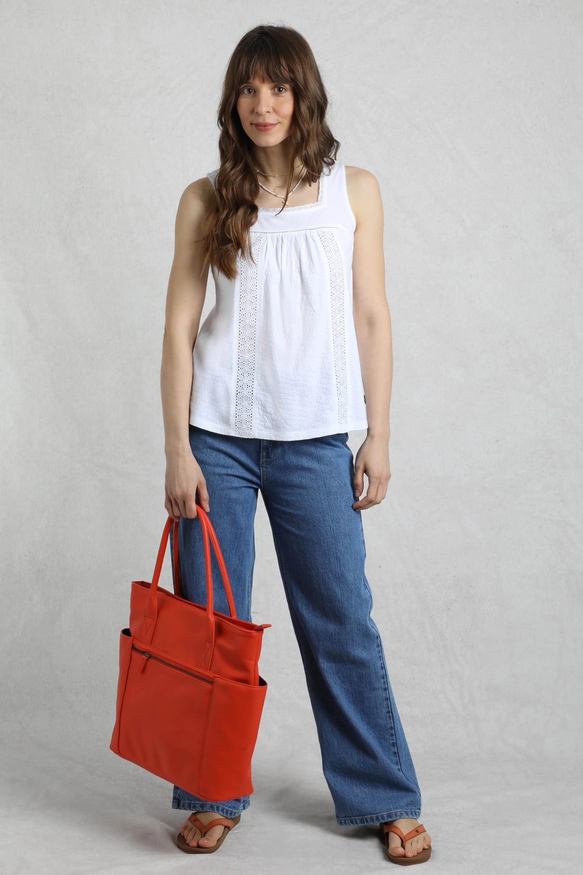The Weird Fish women's Chelle square neck jersey vest in White, made from 100% organic slub fabric. Featuring a square neckline and wide straps for a flattering fit, while the lace strip trim and gathered fabric add stylish detail.