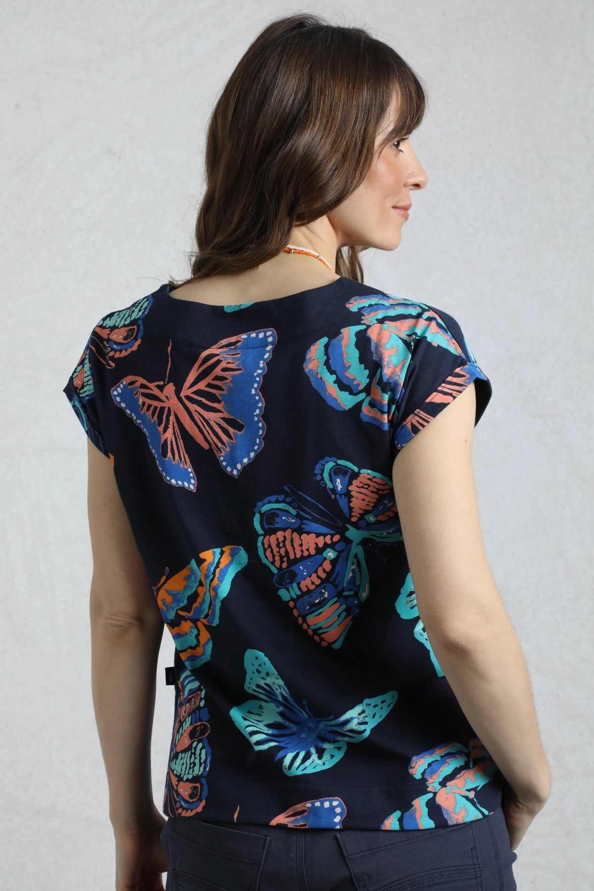 The Weird Fish women's Paw Paw t-shirt, made from 100% organic cotton jersey fabric, this dark blue tee features a bold butterfly pattern, turned back sleeves and curved side seams for a flattering touch.