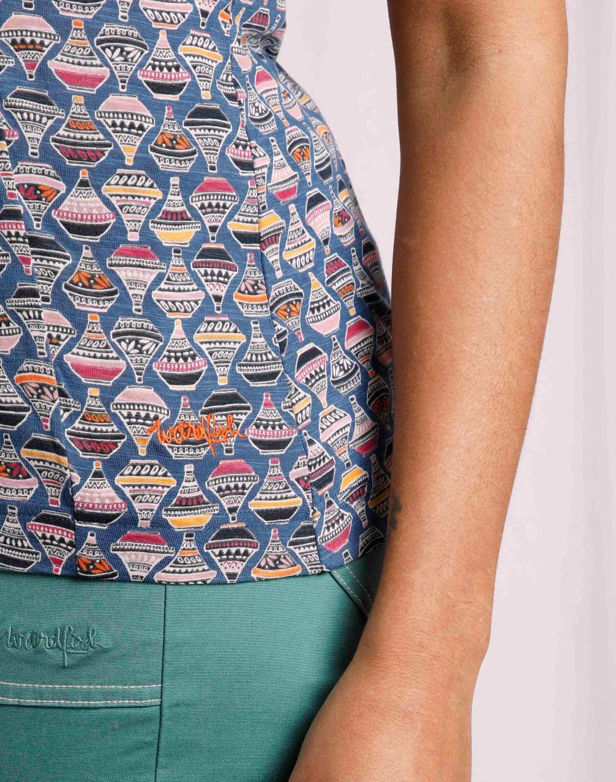 The Weird Fish women's Sonora printed jersey vest, made from a comfortable blend of cotton and modal, this vest features a flattering v-neckline and pintuck empire line detail. The eye-catching blue colour is beautifully accented by a vibrant Moroccan tagine pattern. Perfect for adding a touch of fun to any outfit.